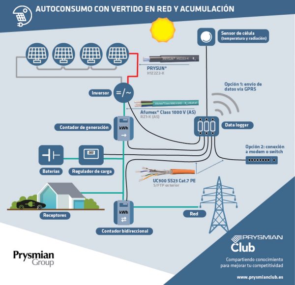 Esquema de aplicação de cabos de energia e comunicações num sistema fotovoltaico para autoconsumo com a possibilidade de fornecimento à rede. O cabo PRYSUN® destina-se para o lado de corrente contínua.